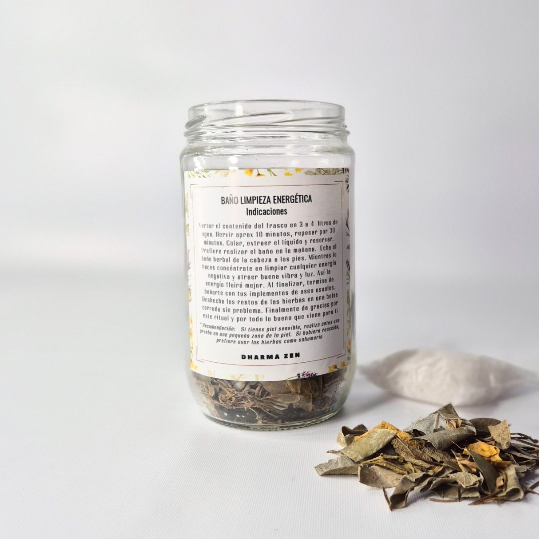 Este baño de limpieza energética es ideal para eliminar energías negativas y atraer buena vibra a tu vida. Con ingredientes como sal marina, ruda, eucalipto, romero, albaca, salvia, y laurel, este ritual te ayudará a sentirte renovado. Para su uso, hierve el contenido en agua y deja reposar. Úsalo preferiblemente por la mañana, desde la cabeza a los pies, visualizando la liberación de malas energías. Disfruta de un baño reparador y renueva tu energía con este poderoso elixir natural. Contenido: 500g.