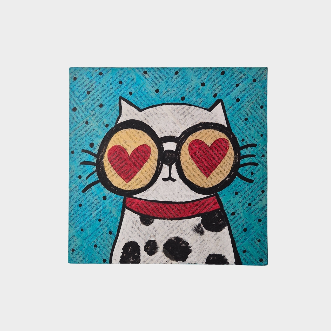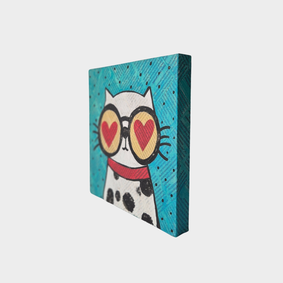 Cuadro sobre madera con un divertido diseño de un gato con lentes en forma de corazón. Su colorido y estilo desenfadado hacen de este cuadro el complemento ideal para decorar cualquier rincón con un toque único.