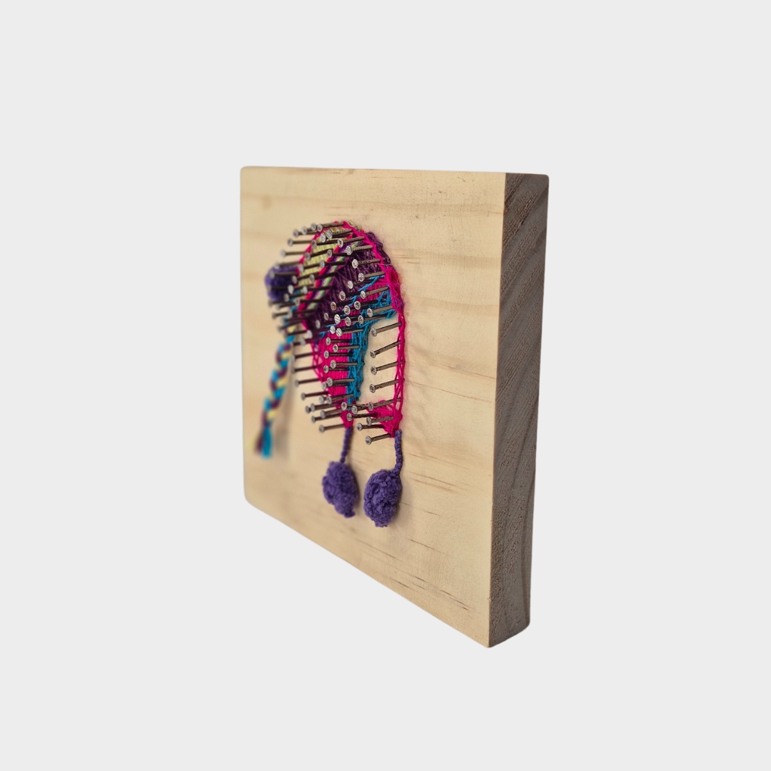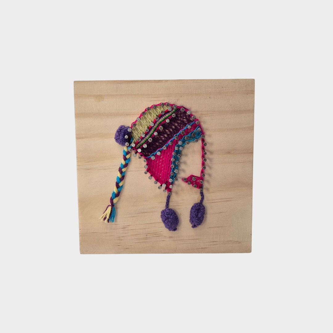 Cuadro artesanal con diseño de gorro andino hecho a mano con hilos coloridos y detalles en pompones tejidos. Ideal para añadir un toque cultural y artesanal a tus espacios.