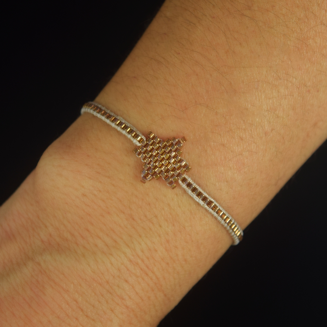 Con un diseño de estrella tejida con cuentas doradas, esta pulsera es perfecta para quienes buscan un accesorio que simbolice luz y guía. Ideal para añadir brillo sutil a tu muñeca, aportando una sensación de energía y sofisticación.