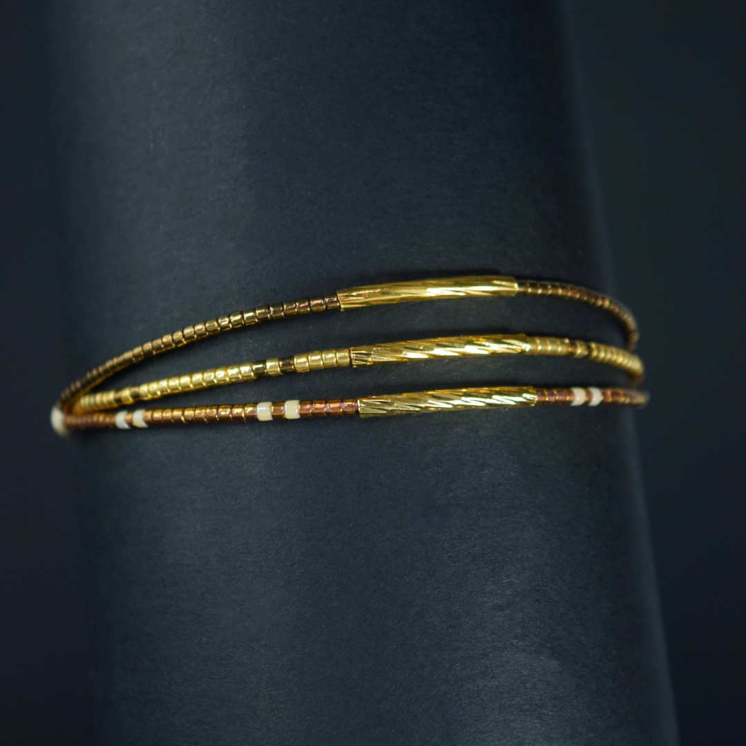 Esta pulsera combina la elegancia del color marrón con tubitos bañados en oro, creando una joya estilizada y poderosa. Perfecta para quienes aprecian el minimalismo con detalles brillantes.