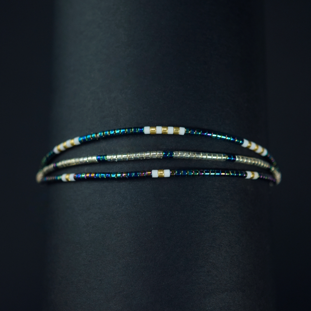 Un diseño fino y elegante con cuentas azul marino y detalles grises, ideal para un look sofisticado y moderno. Perfecta para usar sola o combinar con otros accesorios.