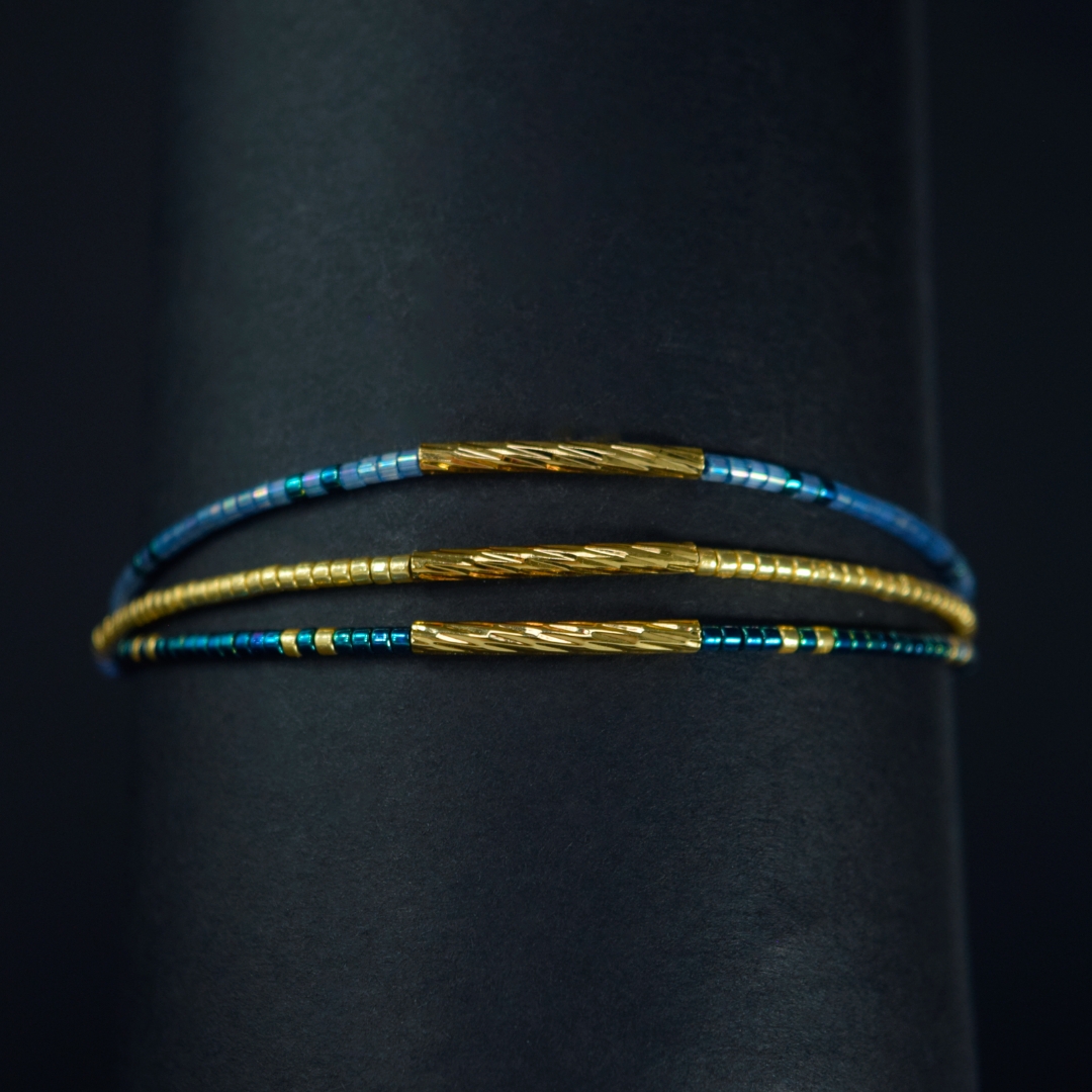 Esta pulsera combina la elegancia del color celeste con tubitos bañados en oro, creando una joya estilizada y poderosa. Perfecta para quienes aprecian el minimalismo con detalles brillantes.