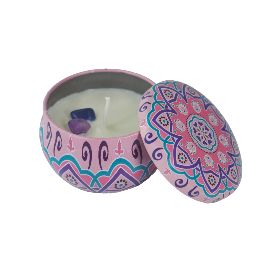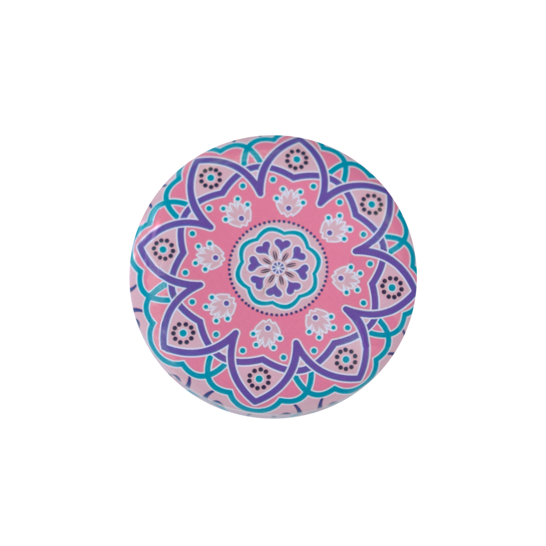 Vela aromática en lata metálica decorada con vibrantes patrones de mandala en tonos rosas y morados. Ideal para crear un ambiente cálido y relajante. Su aroma de Romero es suave y envolvente, perfecto para momentos de meditación y descanso.