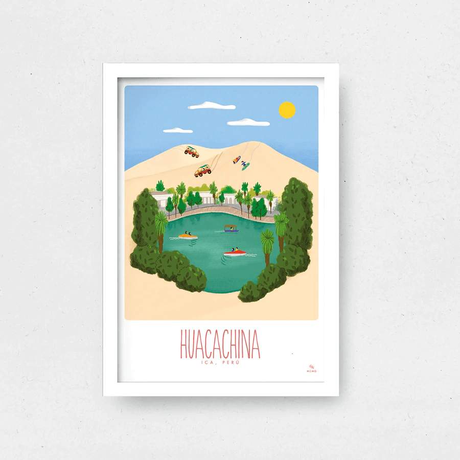 Nuestro Art Print Huacachina fue ilustrado y hecho orgullosamente en Perú. El Oasis del Sur que llena de color y vida el desierto de Ica retratado en una ilustración.