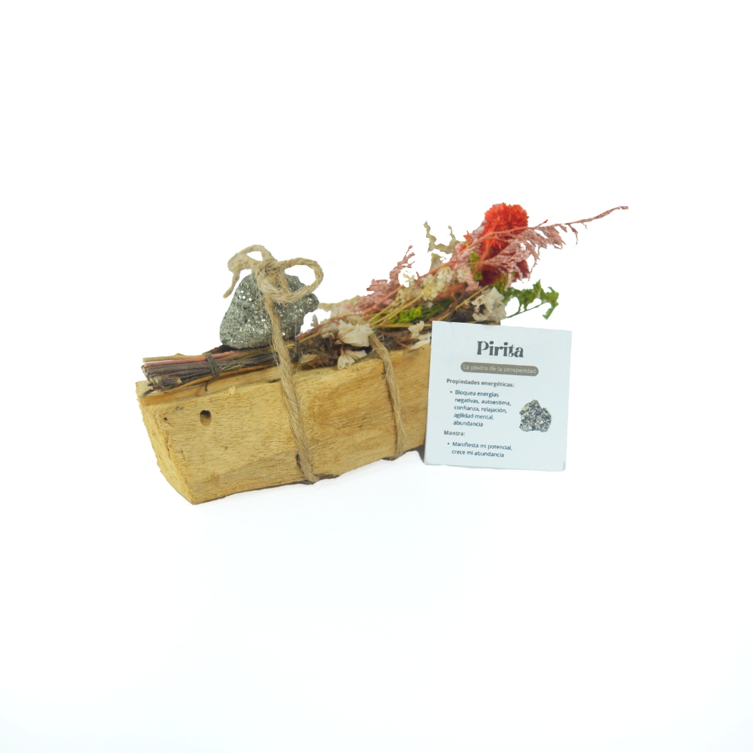 Este kit contiene palo santo, un ramo de flores secas y un cristal de pirita, ideal para atraer prosperidad, protección y energía positiva. La pirita es conocida por sus propiedades de abundancia y éxito, perfecta para limpiar y energizar cualquier espacio, promoviendo bienestar y equilibrio.