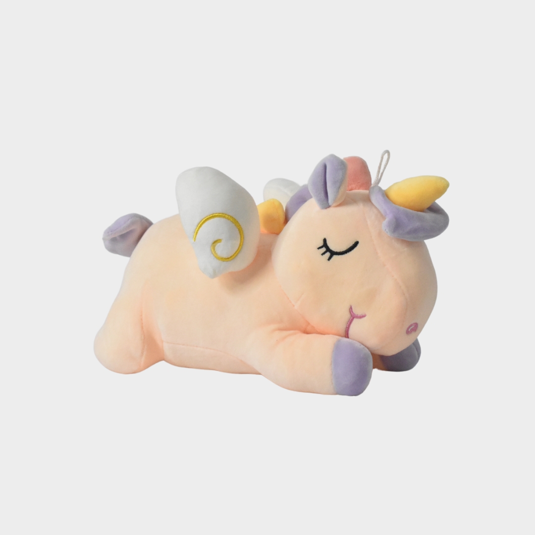 Este suave y adorable peluche de unicornio, en tonos crema y detalles lilas, está diseñado para brindar compañía y ternura a los más pequeños. Con su expresión de descanso y alas doradas, es perfecto para decorar habitaciones infantiles o para acompañar las siestas y momentos de juego. Ideal para quienes sueñan con un mundo mágico lleno de fantasía.