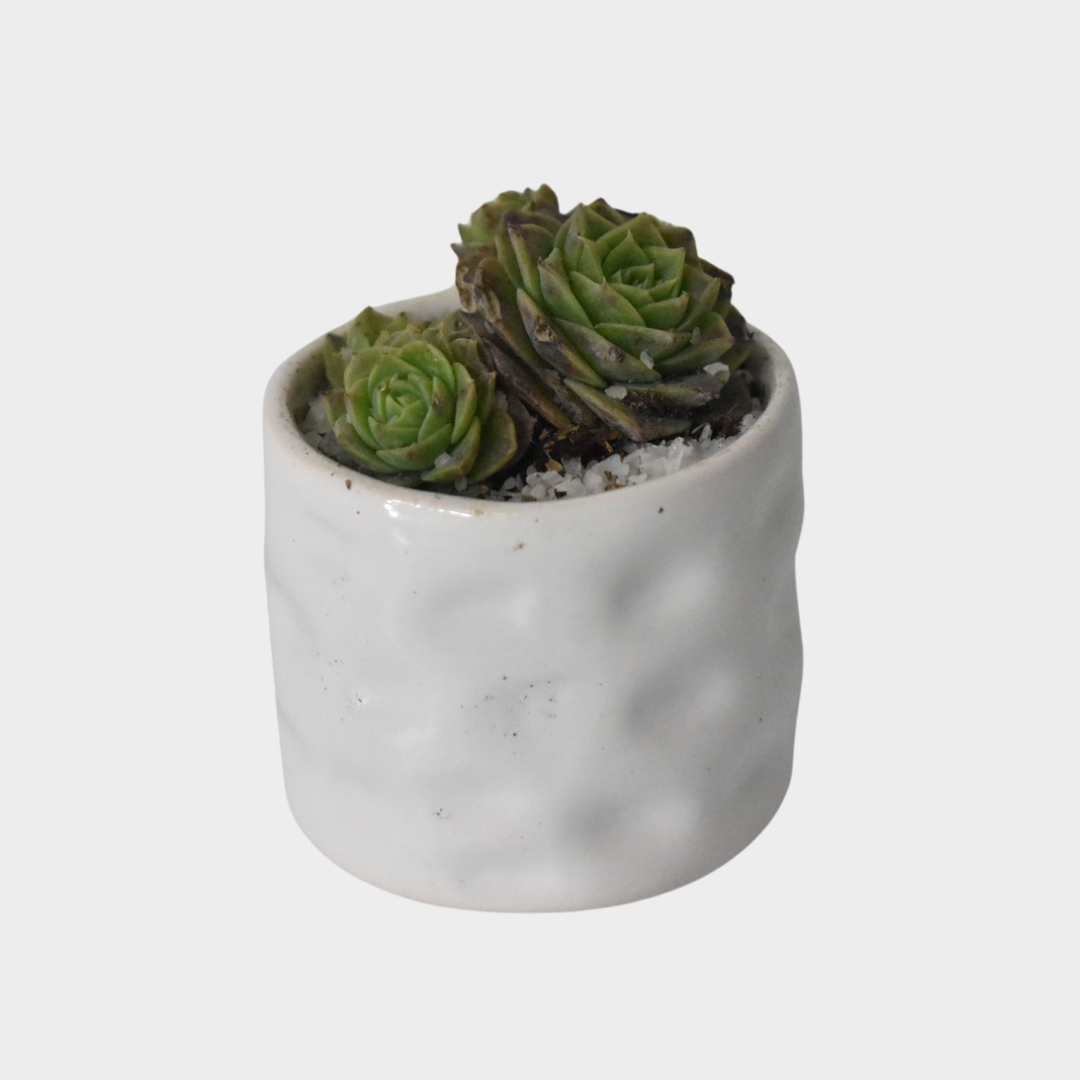 Una hermosa suculenta Echeveria que se presenta en una elegante maceta blanca con textura suave. Su follaje verde y compacto aporta un toque de serenidad y estilo moderno a cualquier espacio. Fácil de cuidar, esta planta es ideal para decorar estanterías, escritorios o cualquier rincón de tu hogar u oficina. ¡Un detalle natural y minimalista que encantará a todos!