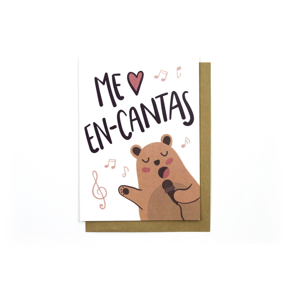 Esta adorable tarjeta con la imagen de un oso cantando y la frase «Me Encantas» es una manera perfecta de expresar tu simpatía o amor. El simpático oso sostiene un micrófono mientras canta, rodeado de notas musicales. Ideal para ocasiones especiales o simplemente para alegrar el día de alguien querido.