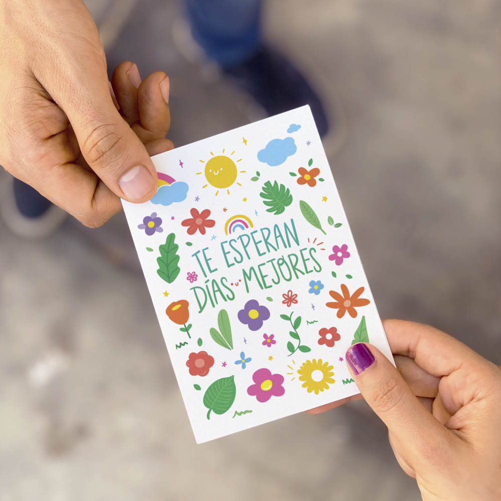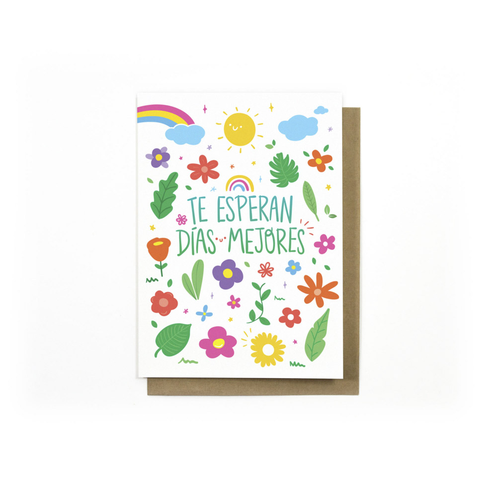 Tarjeta optimista con un diseño colorido de flores, arcoíris y un sol sonriente, acompañada de la frase «Te esperan días mejores». Perfecta para animar a alguien que está pasando por un momento difícil y recordarle que tiempos mejores están por venir. Ideal para compartir mensajes de esperanza y apoyo.