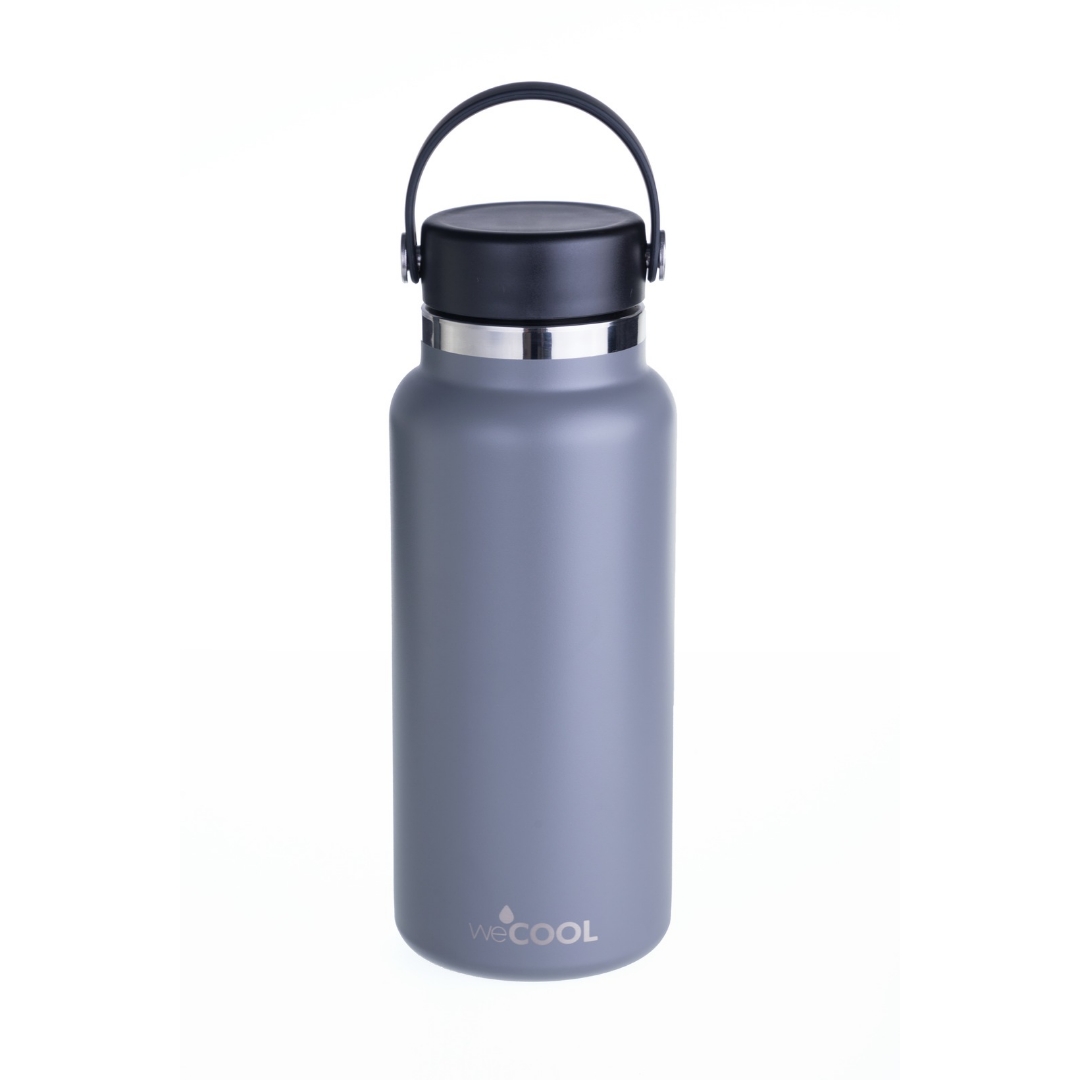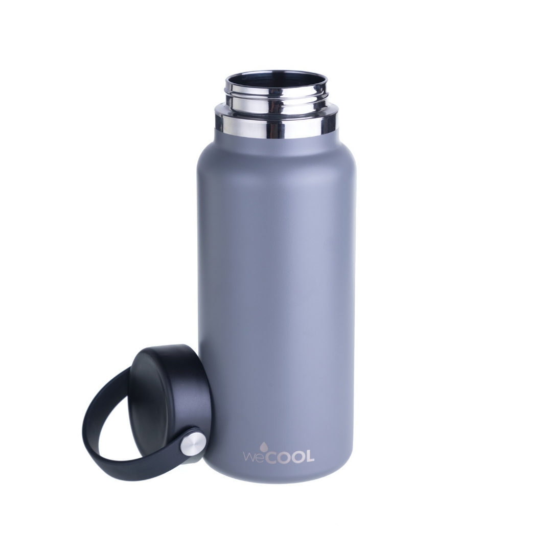 La botella WeCool 1000 ml en color gris ofrece el equilibrio perfecto entre estilo y funcionalidad. Gracias a su tecnología TempTech, tus líquidos se mantendrán fríos por 24 horas o calientes por 12.