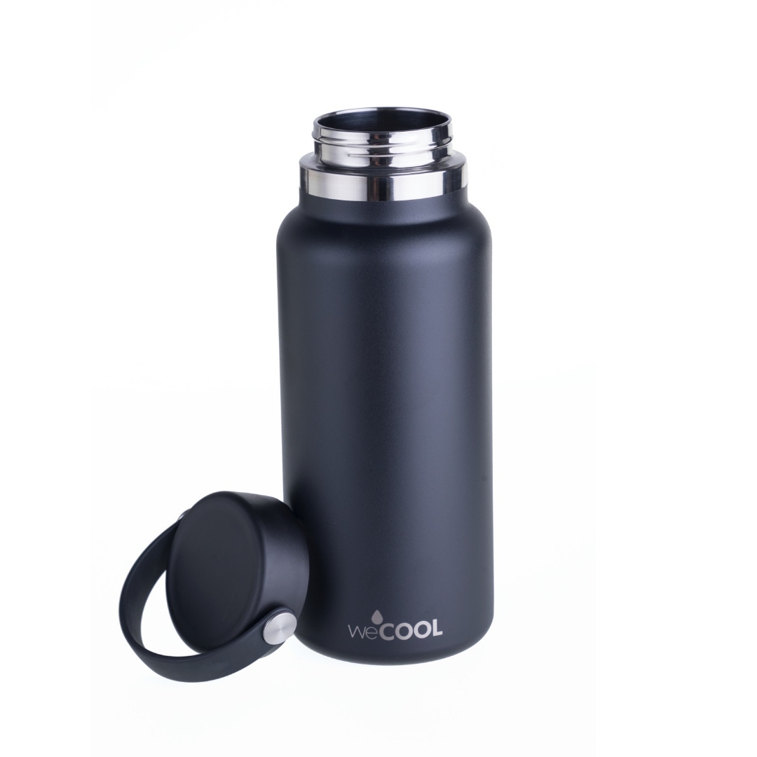 La botella WeCool 1000 ml en negro mate es una opción elegante y funcional para tu día a día. Su tecnología TempTech mantiene las bebidas frías durante 24 horas o calientes por 12 horas, mientras que su construcción de doble pared en acero inoxidable la hace extremadamente duradera y resistente a golpes.