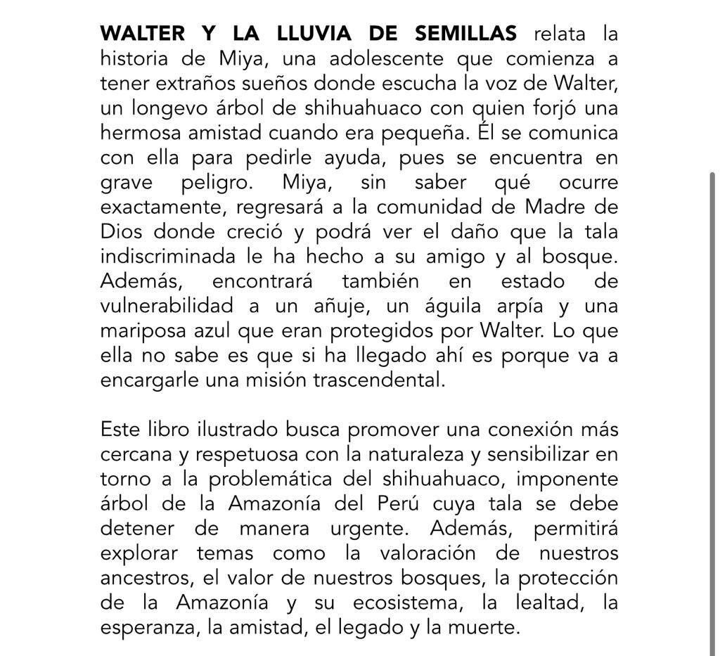 Este libro ilustrado en francés y en castellano, relata la historia de Miya,una adolescente que comienza a tener extraños sueños donde escucha la voz de Walter, un longevo árbol de shihuahuaco con quien forjo una hermosa amistad cuando era pequeña . El se comunica con ella para pedirle. Miya sin saber que ocurre exactamente ,regresara a la comunidad de Madre de Dios donde creció y podrá ver el daño de la tala indiscriminada le ha hecho a su amigo y al bosque. Además , encontrara también en estado de vulnerabilidad a un añuje ,un águila arpía y una mariposa azul que eran protegidos por Walter. Lo que ella no sabe es que si ha llegado ahí es porque va a encargarle una misión trascendental. Este libro ilustrado busca promover una conexión mas cercana y respetuosa con la naturaleza y sensibilizar en torno a la problemática del shihuahuaco, imponente árbol de la Amazonia del Perú cuya tala se debe detener de manera urgente. Además ,permitirá explorar temas como la valoración de nuestros ancestros, el valor de nuestros bosques, la protección de la Amazonia y su ecosistema, la lealtad, la esperanza, la amistad, el legado y la muerte.